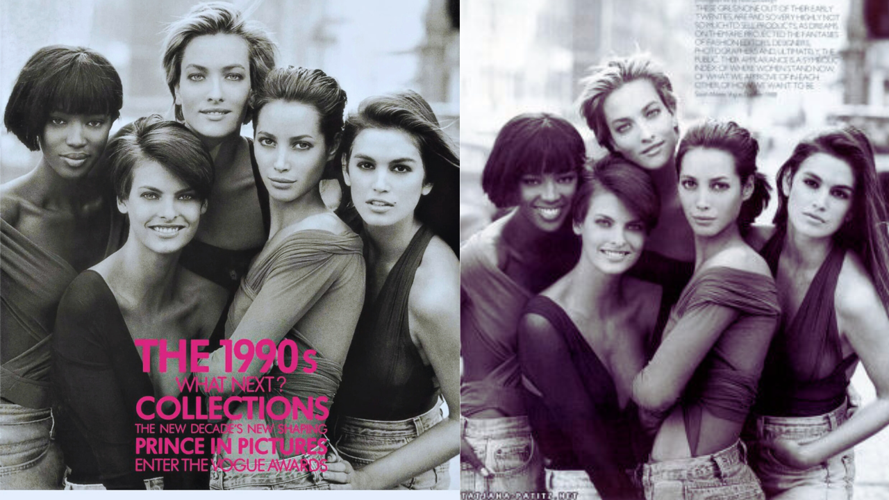 - Vogue’s January 1990 cover featured Naomi Campbell, Cindy Crawford, Linda Evangelista, Christy Turlington, and Tatjana Patitz.